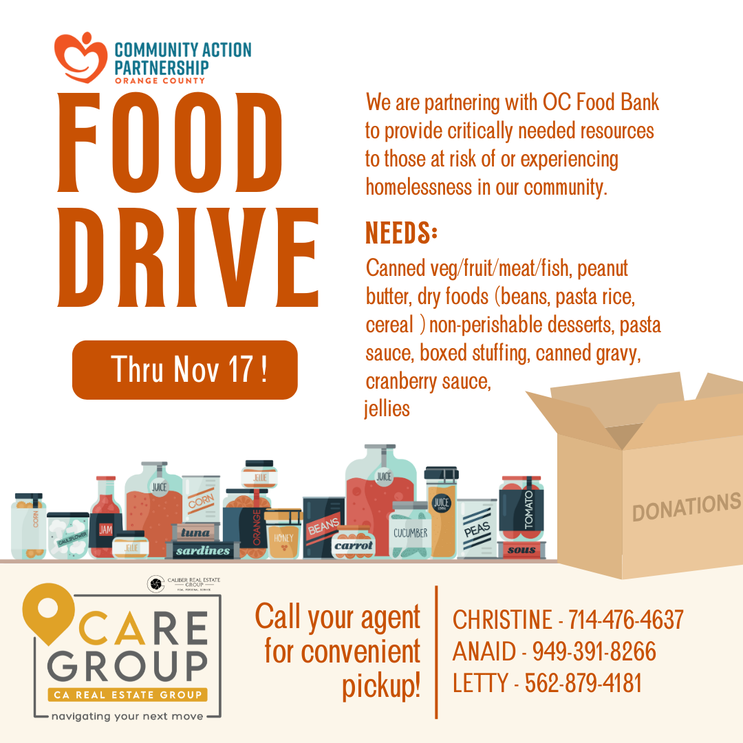 CARE Group will be dropping off the collected food at CAP OC Food Bank at 11870 Monarch Street, Garden Grove, CA 92841 sometime after November 17, just in time for Thanksgiving.