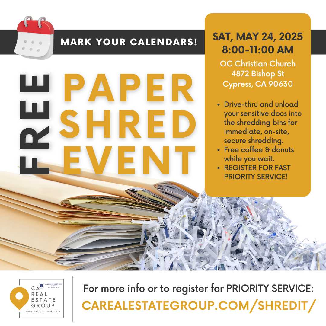 It’s not too late to register for priority service at this year’s FREE PAPER SHREDDING EVENT from 8:00-11:00 AM on Saturday, May 24, 2025 at OC Christian Church, 4872 Bishop St, Cypress, CA 90630.